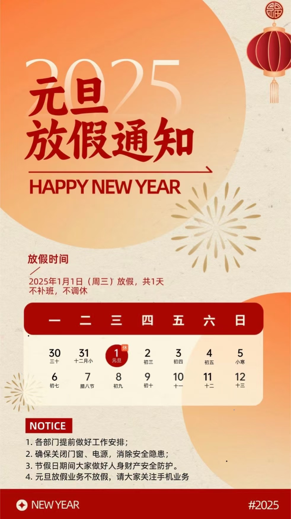 2025年元旦放假時(shí)間在1月1日(星期三),共一天,不補(bǔ)班,不調(diào)休。
